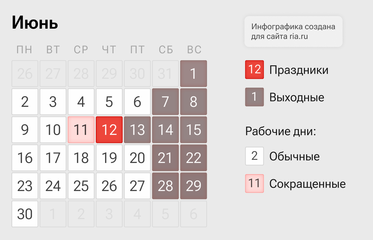- 12 июня (среда) — праздничный день;